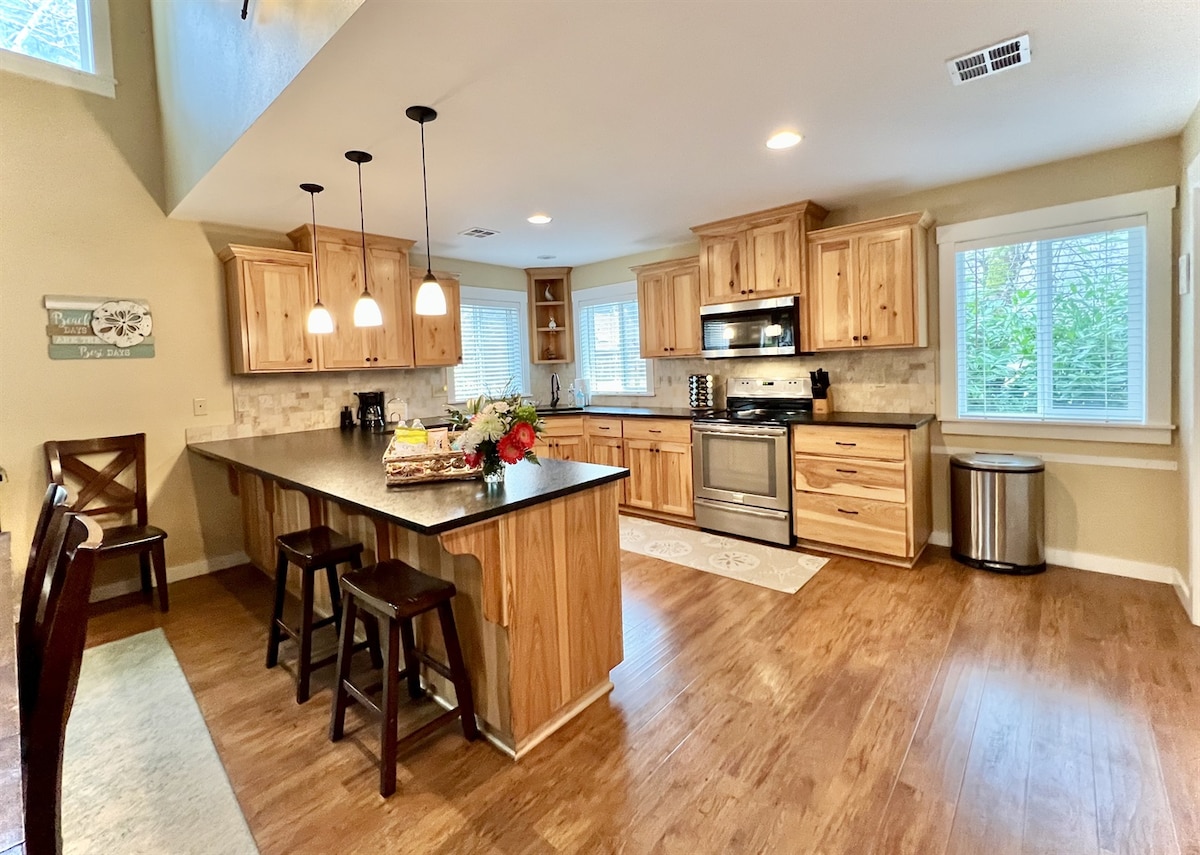 The spacious open floor plan and vaulted ceiling, designed by architect Dennis Norman, makes this place one of a kind! Bordering the forest at the end of the road you are in a secluded oasis located at the top of the hill above Manzanita. With skylights, fabulous kitchen, big wood stove, and cozy bedroom loft, hear the distant surf and the rain on the roof as you wake up or doze off . Yet only minutes away from Manzanita and the beach.