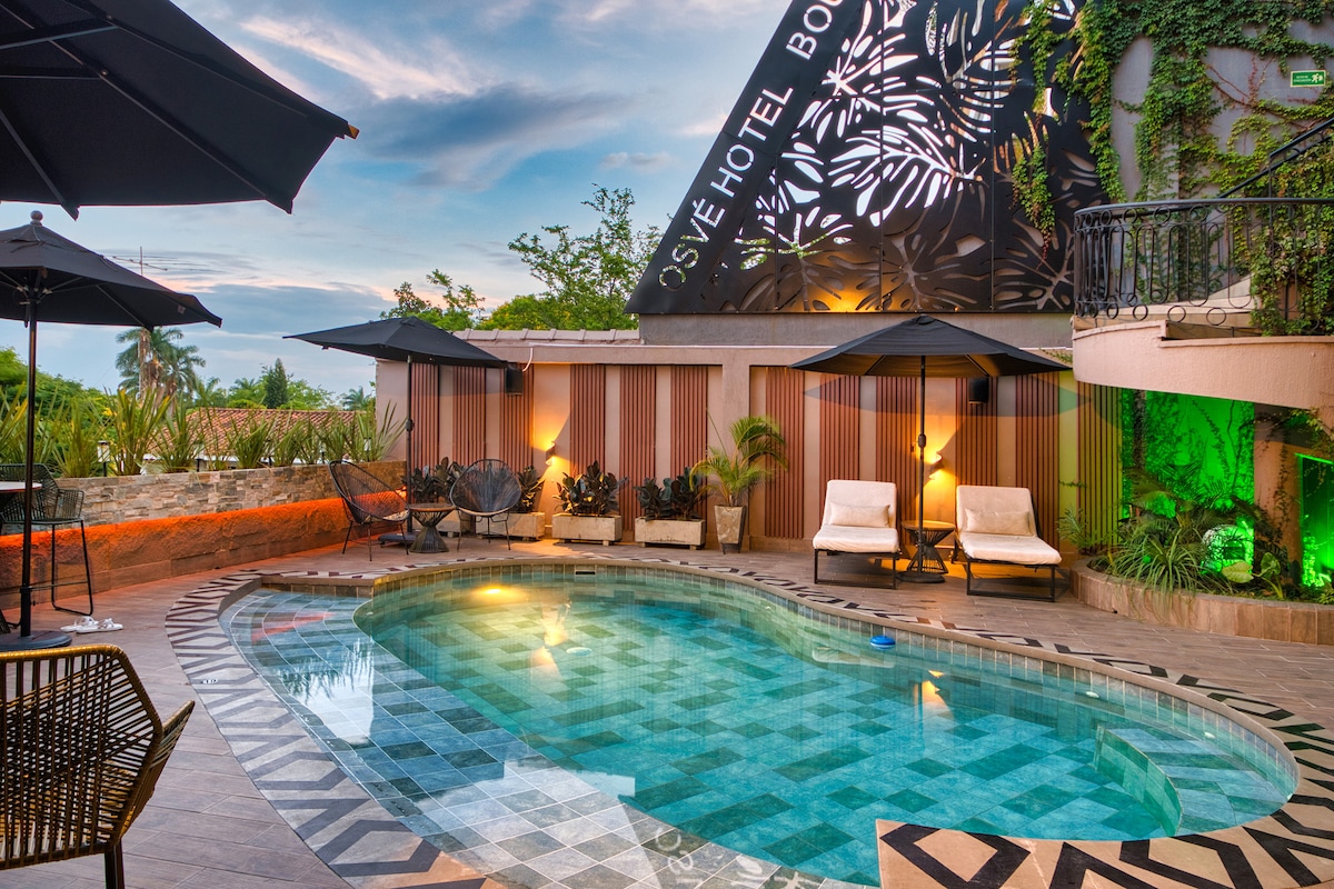 Disfruta de una experiencia con estilo en este alojamiento céntrico. En esta casa hotel boutique, estas 4 habitaciones donde te puedes sentir cómodo y privado, todas las habitaciones tienen baño privado. cuenta con servicio de desayuno con un valor adicional por persona . Somos un hotel boutique de 8 habitaciones y 4 apartamentos de lujo y totalmente temático con diversos estilos para cada gusto. Contamos con desayunos con pago extra, wifi gratis, co-working, piscina y spa .