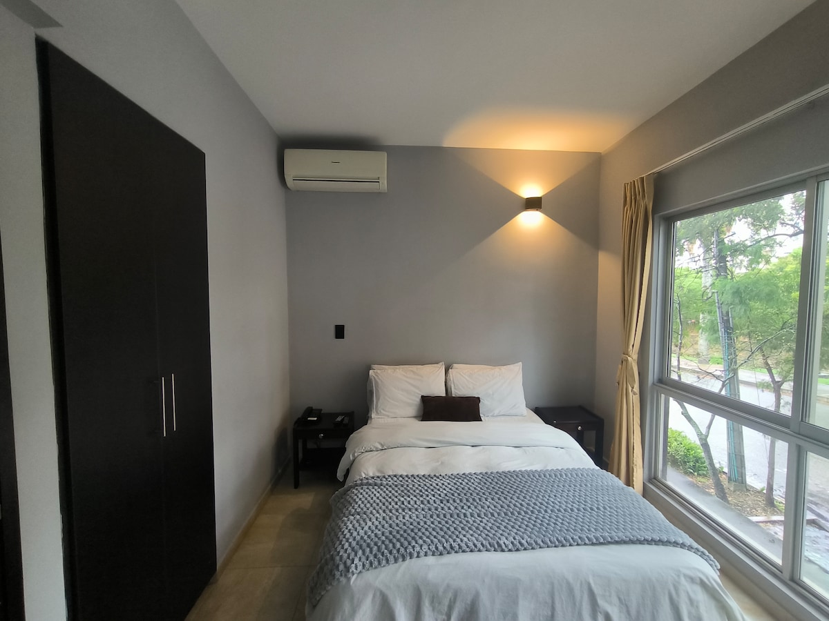 Hermosa habitación de lujo 404, acogedora con servicio de baño totalmente independiente, cama "Queen zise" de 1.60mt, acceso independiente sin limites de horario, chapa electrónica en la puerta de ingreso al edificio y en la habitación, cuenta con todos los servicios básicos como , closet, smart tv, ducha con agua caliente.