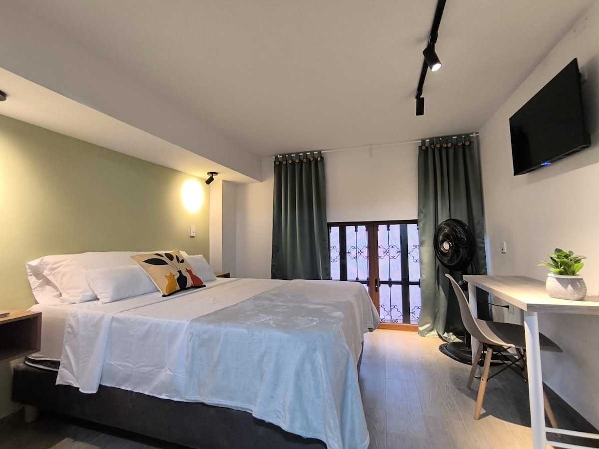 Habitación privada cómoda y bien ubicada en el corazón histórico de Cali, ideal para viajeros que desean explorar caminando lo mejor de la ciudad. Cuenta con baño privado, ventilador, TV, escritorio, WiFi y cocineta equipada con microondas, cafetera y nevera. A media cuadra del Boulevard del Río, 4 museos alrededor, la Calle del Sabor, restaurantes, bares y el Gato de Tejada. Ubicación estratégica en zona turística, cultural y gastronómica. Cerca a San Antonio, Granada y Peñon.