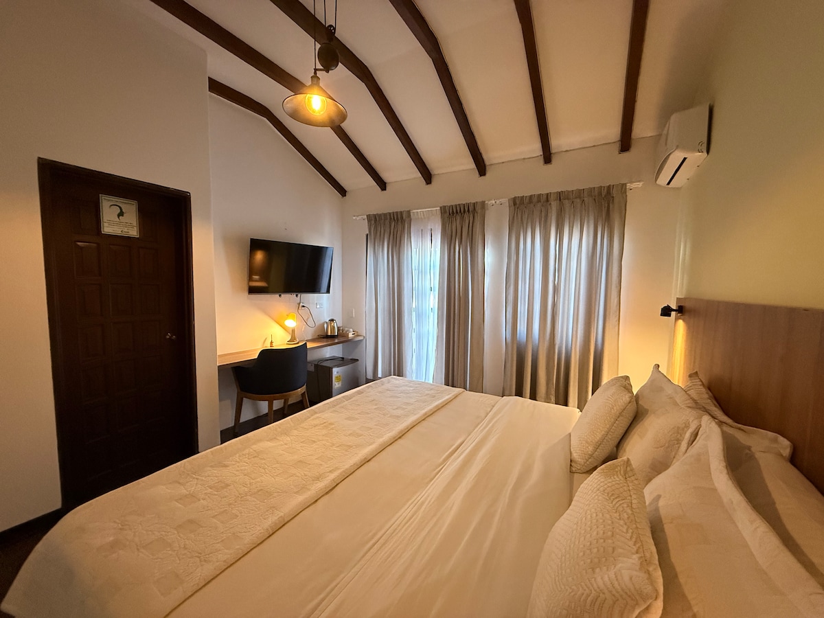 Disfruta de esta acogedora habitación en un entorno natural único. Equipada con una cómoda cama Queen, balcón privado, baño moderno y una práctica cafetera para tu comodidad. Un espacioso escritorio te permite trabajar mientras disfrutas del espectáculo de aves que frecuentan el entorno. Ideal para relajarse y conectar con la naturaleza.