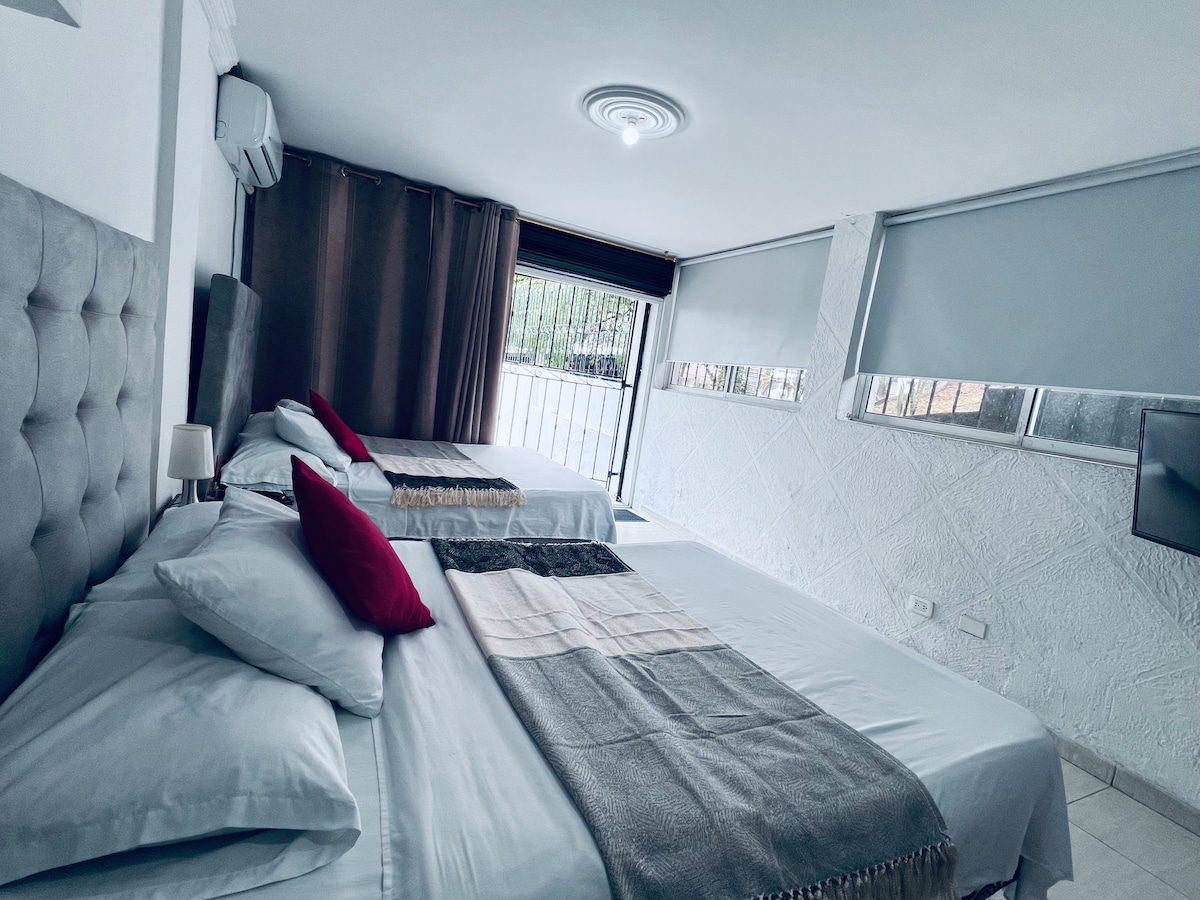 Disfruta de la belleza y modernidad de este alojamiento tranquilo y céntrico . Cuenta con: CAMA QUEEN, colchón semi ortopedico, AIRE ACONDICIONADO, smart TV, ZONA DE TRABAJO, INTERNET DE ALTA VELOCIDAD, clóset. Baño completo, DUCHA CON AGUA CALIENTE. COCINA completa y dotada. SOFACAMA Cercano a las Canchas Panamericanas, Estadio Pascual Guerrero, centros comerciales como Palmetto Plaza, Mallplaza, Cosmocentro y a las principales clínicas de la ciudad como Imbanaco y Farallones.