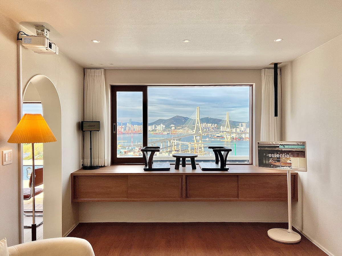 @stay8usanhang is a space overlooking Busan Port, thoughtfully designed to offer comfort and inspiration. Every detail, from music and fragrance to ambiance, interior, and bedding, has been carefully curated to enhance your stay. -Sky bridge connected to Busan Station (5-minute walk) -1 Super King bed, 3 Super Single beds Ocean-view bathtub (spa-ready) - Fully equipped / ideal for family travelers 50-inch large TV with Netflix, YouTube, OTT, and broadcast channels Bang & Olufsen speakers