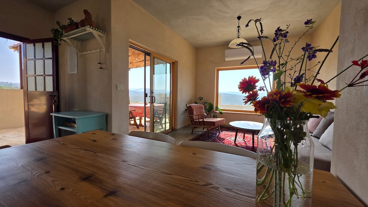 A magical cabin in a Galilean landscape, equipped with everything, overlooking the forest with an outdoor garden and a mountain view A pampering outdoor double bath Outdoor seating area, fire table TV with a variety of channels wifi Air conditioners in the bedroom and in the living room Fully equipped kitchenette Herbs in the garden for tea Nespresso machine sheets and towels, Hot water system Option for delicious double breakfasts