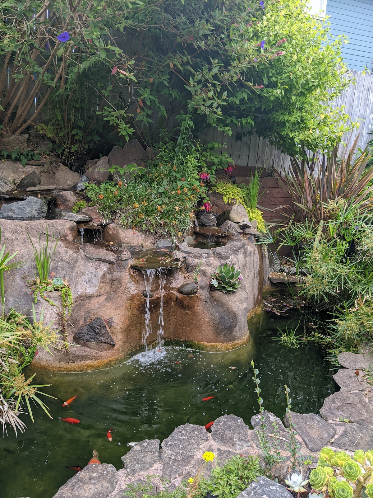 Spend time among the redwoods near the fish pond in our elegant modern retreat with many artistic custom elements. Let the tension from the road melt away in our hot tub and spa like rain shower, then relax on our comfortable California King beds. Located in an upscale quiet neighborhood in the hills above Arcata, near extensive redwood hiking trails. Unwind in our sheltered outdoor living room, with a fire pit by the pond. **Please keep voices low out of consideration for the neighbors.**
