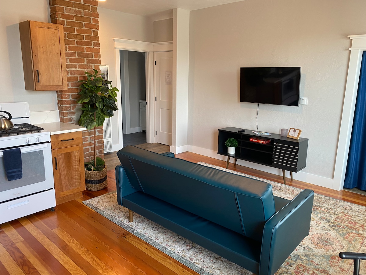 Excellent location with views of the redwood forest. Our bungalow is fully equipped. Come home with your farmer's market bounty and make use of the well-stocked kitchen or balcony grill. Get cozy in the living room at the push of a button with the gas fireplace and Smart TV. Sleep soundly on either the king or queen-sized bed. If you have extra people I can provide an air mattress. Walk from your door to Cal Poly Humboldt, the Arcata Plaza, and Shay Park. A wonderful home base.