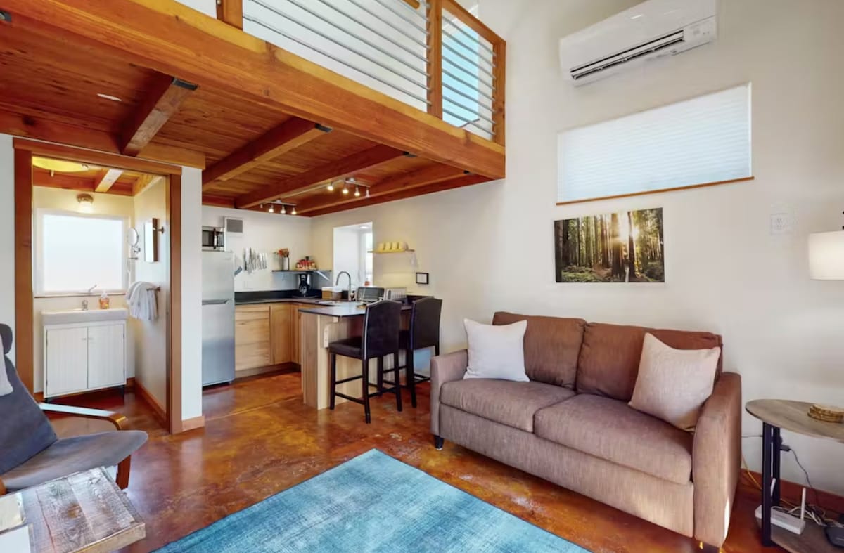 Cozy, bright, and intimate 1-bedroom tiny house with private outdoor area. Don't be fooled by her 264-square-foot size. Mini packs comfort in all the right places. Equipped to host just two optimally, but up to four guests — it has a queen bed in the snug bedroom, and a double (full-size) sofa bed in the living area. Our garage makeover project created a home with a small footprint but big on style. Blocks to the Arcata Plaza, near shopping, dining & bars.