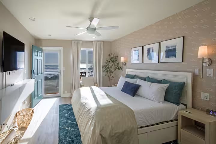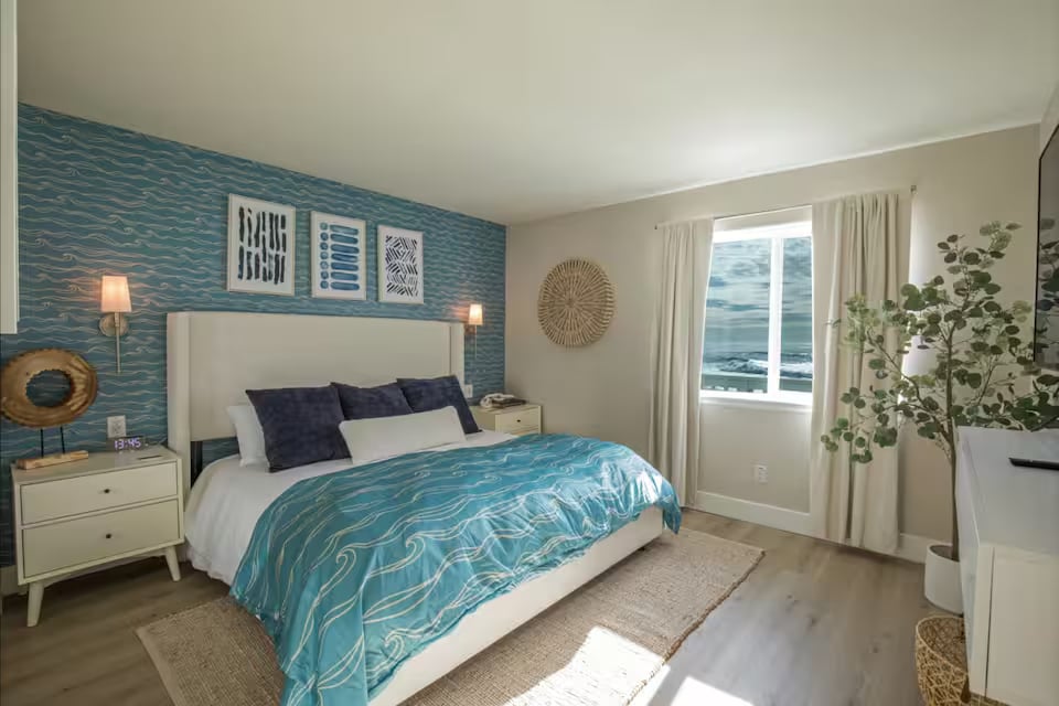 Room Three in the Historic Schoolhouse Inn is a spacious family suite with a king bed and a half room with a queen bed, ideal for families or friends traveling together. Step outside to enjoy two private decks—one with sweeping views of the ocean, the other overlooking the park, shared backyard and redwoods . Inside, unwind with plush linens, a full coffee bar, Smart TV, and a beautifully renovated bathroom stocked with refreshing amenities for a relaxing stay. *4 guests only this room*