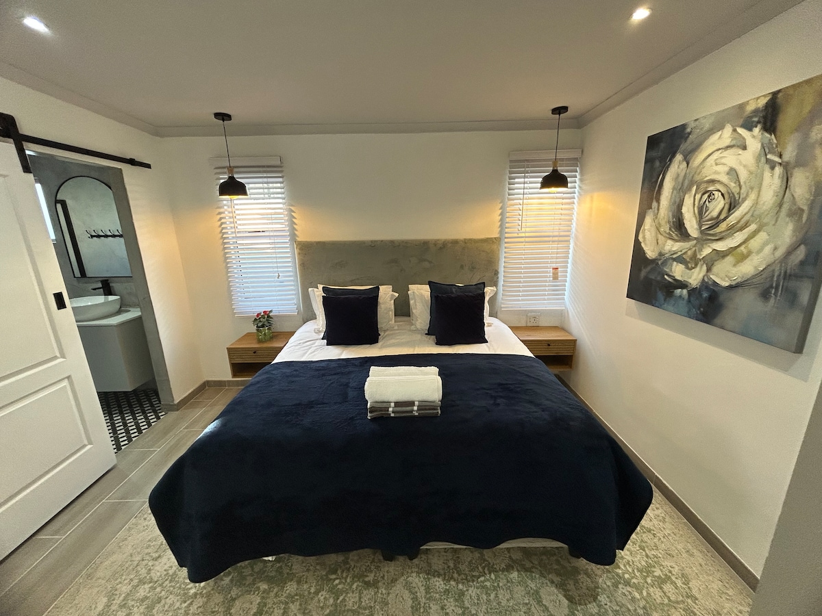 Our secure garden cottage has it's own entrance, with use of swimming pool and braai facilities. The space is newly renovated, with Egyptian cotton bedding, a kitchenette with refrigerator, microwave and kettle. Tea, coffee, milk and bottled water are provided. Spacious shower in the bathroom. Uncapped wifi, a desk for work, and Netflix and Showmax available. Enjoy sundowners on our deck overlooking the pool. You also have your own private outdoor seating area perfect for alfresco meals.