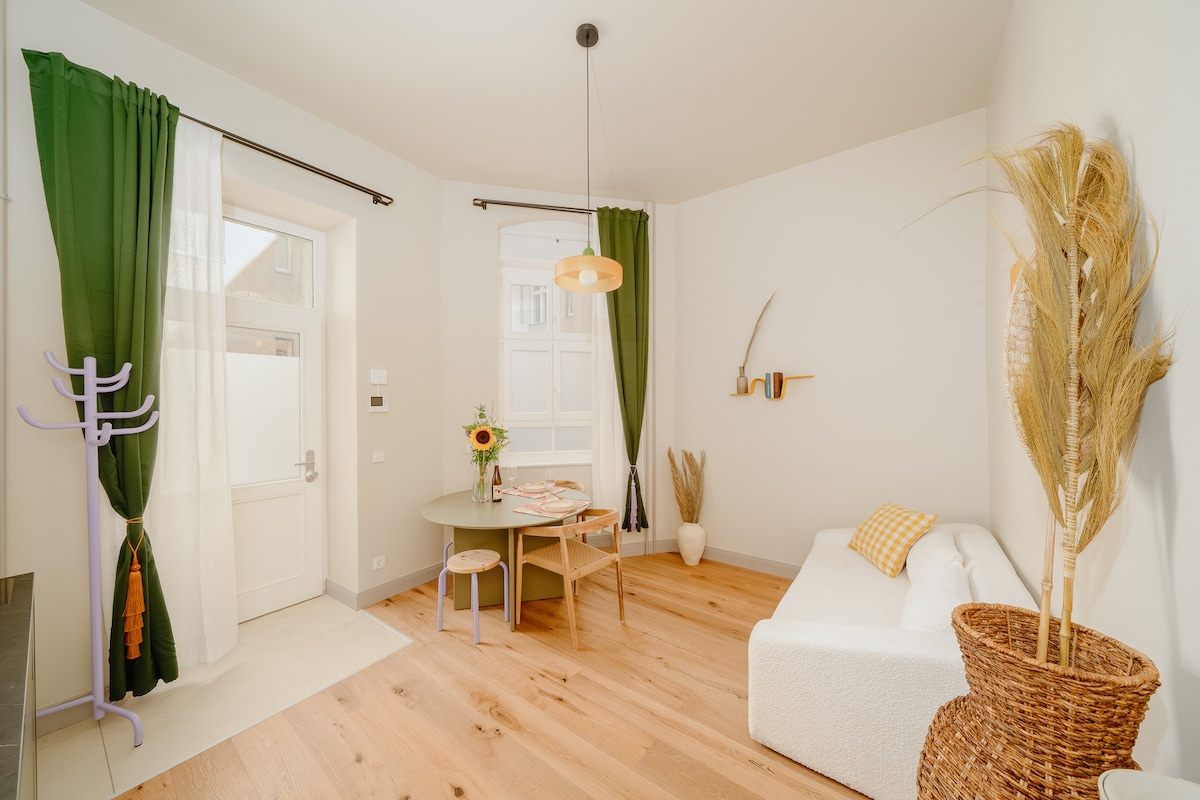 Boutique apartment with oak flooring, projector, floor heating, designer kitchenette, coffee machine and a 180 × 200 cm king-size bed plus a 140 × 200 cm sofa bed. Modern bathroom with walk-in rain shower. 24/7 keyless self-check-in via Nuki, 200 Mbps Wi-Fi. City West, right by Volkspark: jogging paths, picnic lawn, weekly market. U-Bahn, Ringbahn, buses and e-scooters just minutes away. Quiet yet central—perfect for couples, solo travellers and remote workers.
