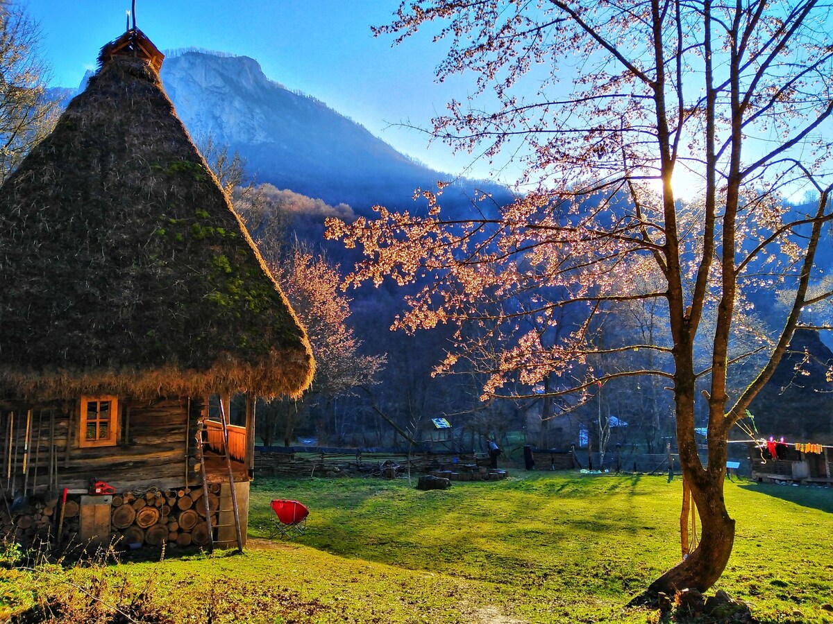Cheia village is located in the heart of the Apuseni Mountains of Transylvania, right next to the beautiful Râmeț Gorges (Cheile Râmețului) and three other scenic gorges. We are surrounded by forests, majestic mountains, and wild landscapes. The guesthouse is a renovated, original thatched house from the 19th century. Our place is remote and can be reached on foot via a marked trail or by 4x4 in dry weather, with proper tires. We can also arrange transport by car from Brădeşti to our location.