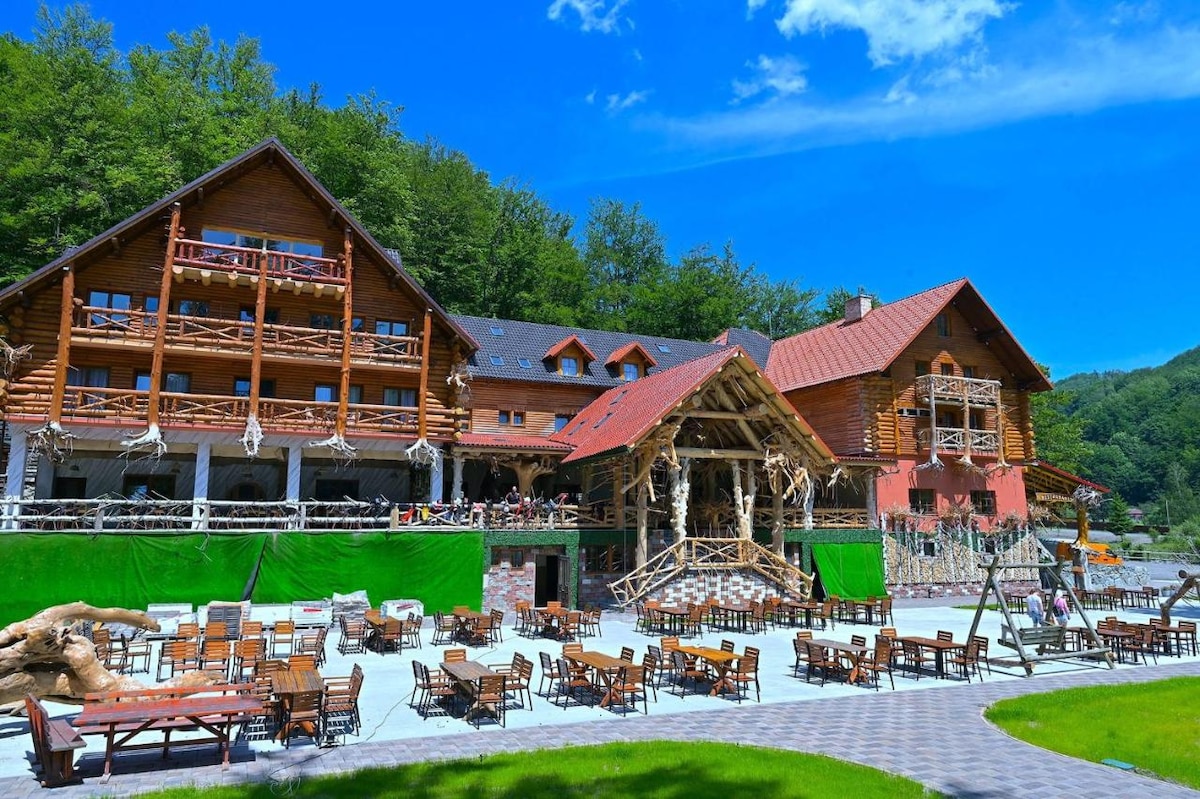 Situated in Petrila, 44 km from Ranca Ski Resort, Cheile Jieţului - Conacul Rădăcinilor features accommodation with a garden, free private parking, a terrace and a bar. Guests can use the hot tub, or enjoy mountain views. At the hotel, rooms have a desk, a flat-screen TV, a private bathroom, bed linen and towels. The rooms have a wardrobe.You’ll love the stylish decor of this charming place to stay.