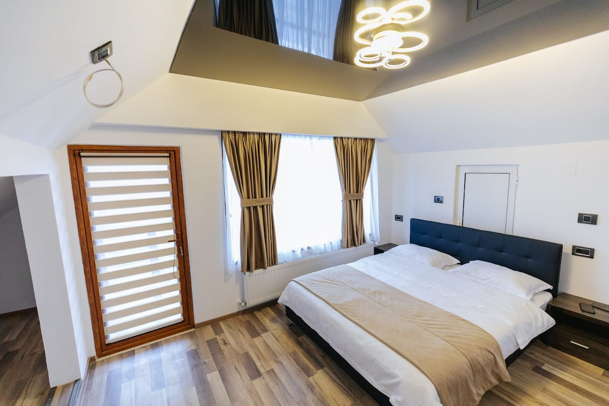 Absolut Residence in a newly built American style vila, locate only 3 km from hateg city center, 7 bedrooms with private bathroom, wifi, smart TV, Kitchen and outdoor patio with two barbecue We have: 1 room quadruple 1 room triple 1 double room with balcony facing Retezat mountains 1 double room with own patio 3regular double rooms All bedrooms have own bathroom