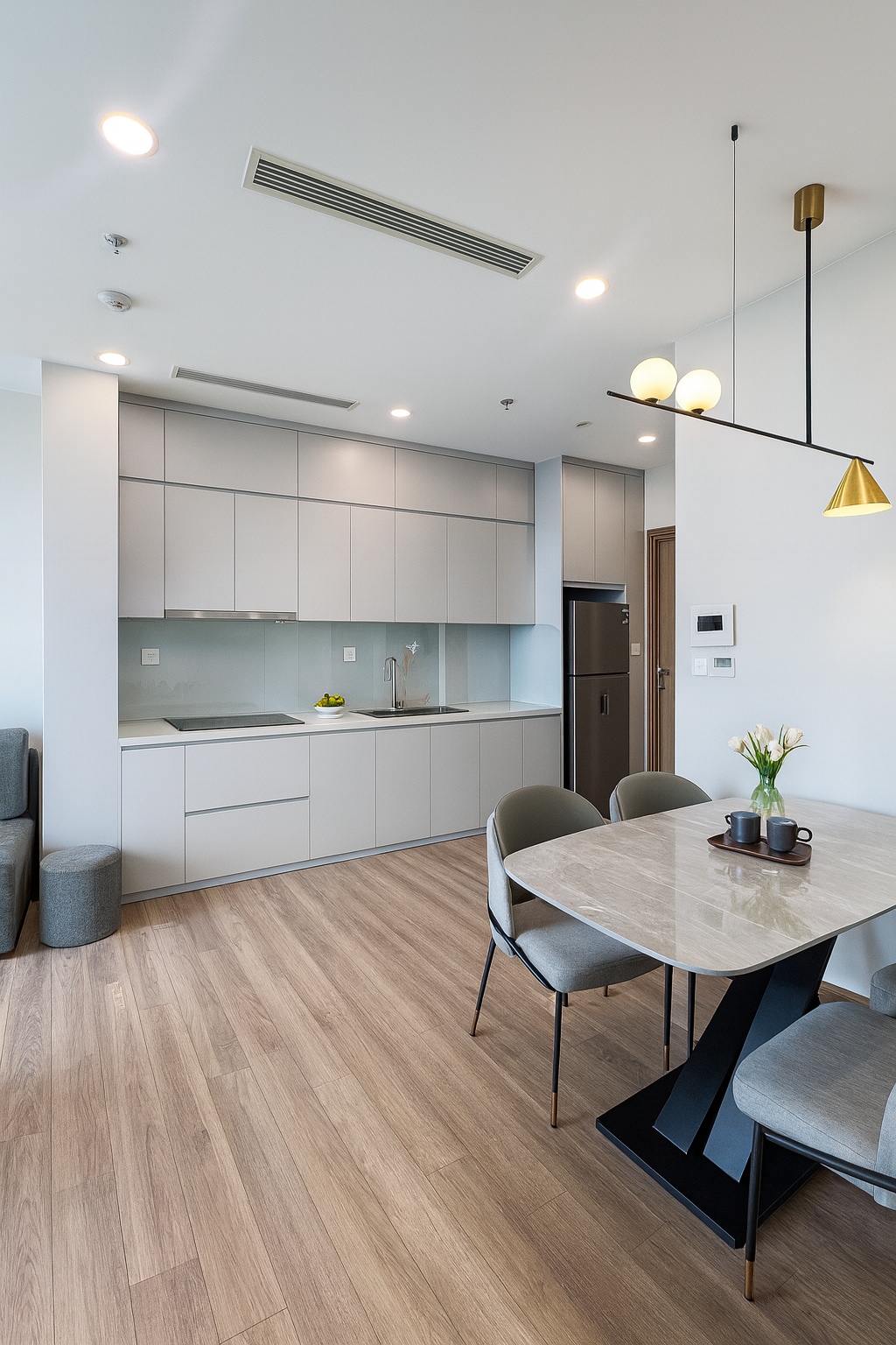 The apartment is designed in a minimalist yet cozy style, offering a peaceful and relaxing atmosphere. Enjoy the green park view right in front of the building – perfect for morning meditation or a gentle walk. Just to the left is the Japanese-style onsen and hot water swimming pool, where you can unwind after a long day. One building away is West Bay food street, featuring a wide variety of delicious cuisines from Asia to Europe, along with plenty of tea and coffee shops.