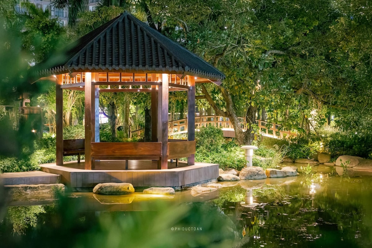 Relaxing with family at this peaceful residence, experiencing Onsen hot springs right up to your room. - Free sauna in house. - Gym available for free. - Hot mineral bath price 100.000VND/tub. - Combo Mori Onsen ticket for hot mineral baths &body massage only 450.000VND - Infinity four-season swimming pool (130.000VND/ticket) - Free hair wash for booking from 5 nights. - Opposite the central park Hồ Thiên Nga, perfect for camping, kayaking. - Electric shuttle service for sightseeing in Ecopark.