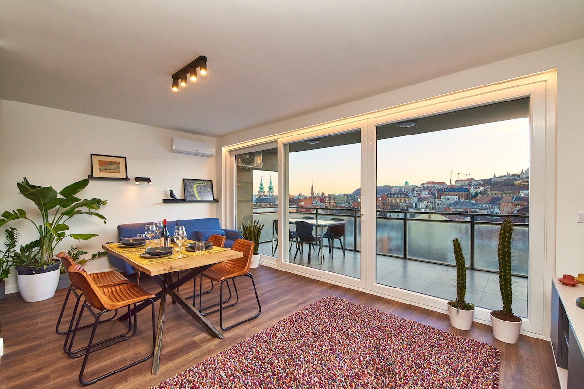 Páratlan panorámával rendelkező luxus apartmant kínálunk vendégeinknek magas minőségben. Központi helyen van, pár lépésre tömegközlekedéstől, a Margit szigettől, bevásárlási lehetőségtől.A 7. emeleten lévő erkélyről csodálhatjuk éjjel nappal a Parlament és a Duna látványát. Az apartmanban gyors wifit, 3D-s televíziót, kávéfőzőt, klímát, mosó-szárítógépet, pihe-piha törölközőket és kiváló minőségi textíliákat és bútorokat találhatnak a vendégeink.