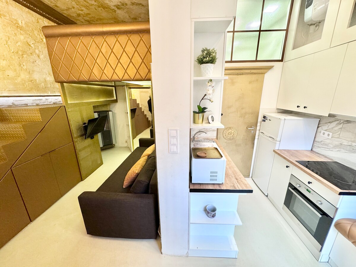 The charming air-conditioned apartment is on the 2nd floor with its windows and balcony looking on a green walking street giving it a quiet enjoyable atmosphere. The flat is located in the downtown of Budapest, the area is called 'little Paris'. You can enter with an Easy Check-In System: No keys needed just two codes I give you and you are in. It has one room with a double bed. It has a kitchen corner. You can find the washing machine in the bathroom with shower.