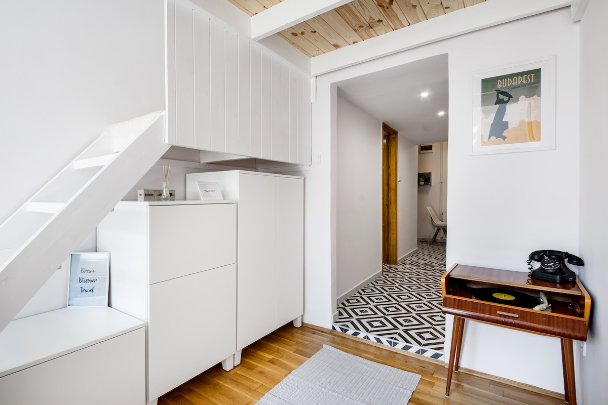 Rose39 is a trendy and romantic loft apartment with one double bed. It is a perfect choice for couples. Find yourselves in this neoclassical building built in XIX century and snuggle up in a cozy mezzanine bedroom. The space is sparkling bright, modern, designed in white with decor of map art, quirky vintage phone and monochrome geometric tiles blend with pops of sunny yellow for a chic contemporary look. The authentic courtyard is the perfect place to have a bottle of rosé in a fresh summer night. The apartment is located 10 mins walk between the famous party quarter and Heroes square. The house was designed by Károly Hild, one of the greatest architects of the 19th century and built in 1867 on behalf of a wealthy card manufacturer. However, some architectural blunders from the communist times can still be discovered on the building. The house has an internal staircase that leads to the first floor where the apartment is located. You can enjoy the interior courtyard while sitting in the hallway at a table and having a drink. The beautifully and newly furnished apartment is equipped with: free wi-fi, heater for winter, air condition for summer, washing machine, microwave, cooking utensils, coffee maker, toaster and a kettle. The famous and spectacular Andrassy Avenue with its numerous historic villas, embassies and residensies is only a few minutes walk. Running parallel to Andrássy út, the mile-long historic Király Street is a modern retail, bar and party hub in the middle of Pest. Another must-see attraction is the Széchenyi Bath only 3 metro stops away. The Metro Line 1 is the oldest metro on the European continent. If you feel like exploring the city without using the public transport, it is also possible as you can reach almost all highlights with a pleasant walk. Rose39, the freshly renovated apartment is only a walking distance away from the heart of the downtown. The mile-long Király Street, only a block away, is a cool restaurant, bar, and party hub in the middle of Pest. Various grocery shops are awaiting you around the clock in the neighborhood. ATM, Banks, pharmacies are also nearby. There is a tiny cozy park just next to the building where you can relax after a long day. The METRO LINE 1, Vorosmarty station is the closest metro ; it is the oldest metro line in mainland Europe. The main tram lines 4 and 6 are 7 minutes walk away and trolleybus stops 2 minutes walk away. Rose39, the freshly renovated apartment is only a walking distance away from the heart of the downtown. If you want to feel the big city vibe, don’t miss the illustrious Andrassy Avenue, home of historic villas, embassies and residences. The mile-long Király Street, only 1 minute away, is a cool restaurant, bar, and party hub in the middle of Pest. Another must-see, the Széchenyi Bath is only 3 metro stops away. Various grocery shops are awaiting you around the clock in the neighbourhood.
