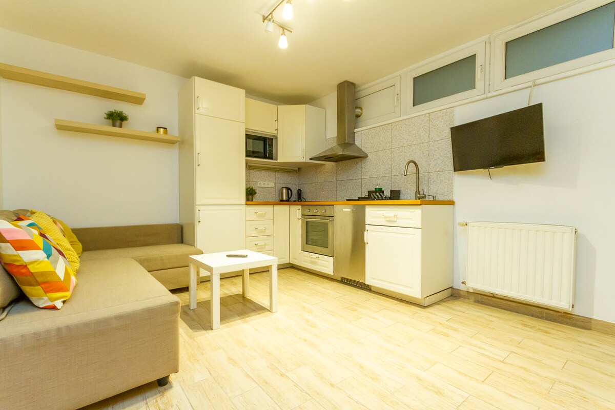 This raised-bedroom ground-floor apartment in Budapest’s vibrant 9th district features a bedroom and workspace on an elevated level, offering privacy and clear separation from the living area. Ground-floor access makes entering with luggage hassle-free 🚌 Excellent transport links, including trams, buses, and the HÉV at Boráros Square, plus nearby MVM Dome and Müpa, make it ideal for city exploration, events, and cultural programs. 🎶 Perfect for couples or solo travelers.🌆✨