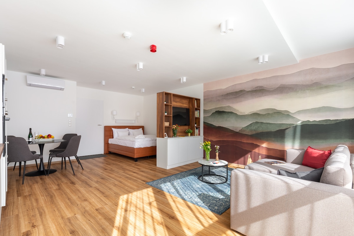 现代中央1卧室公寓,带阳台或露台