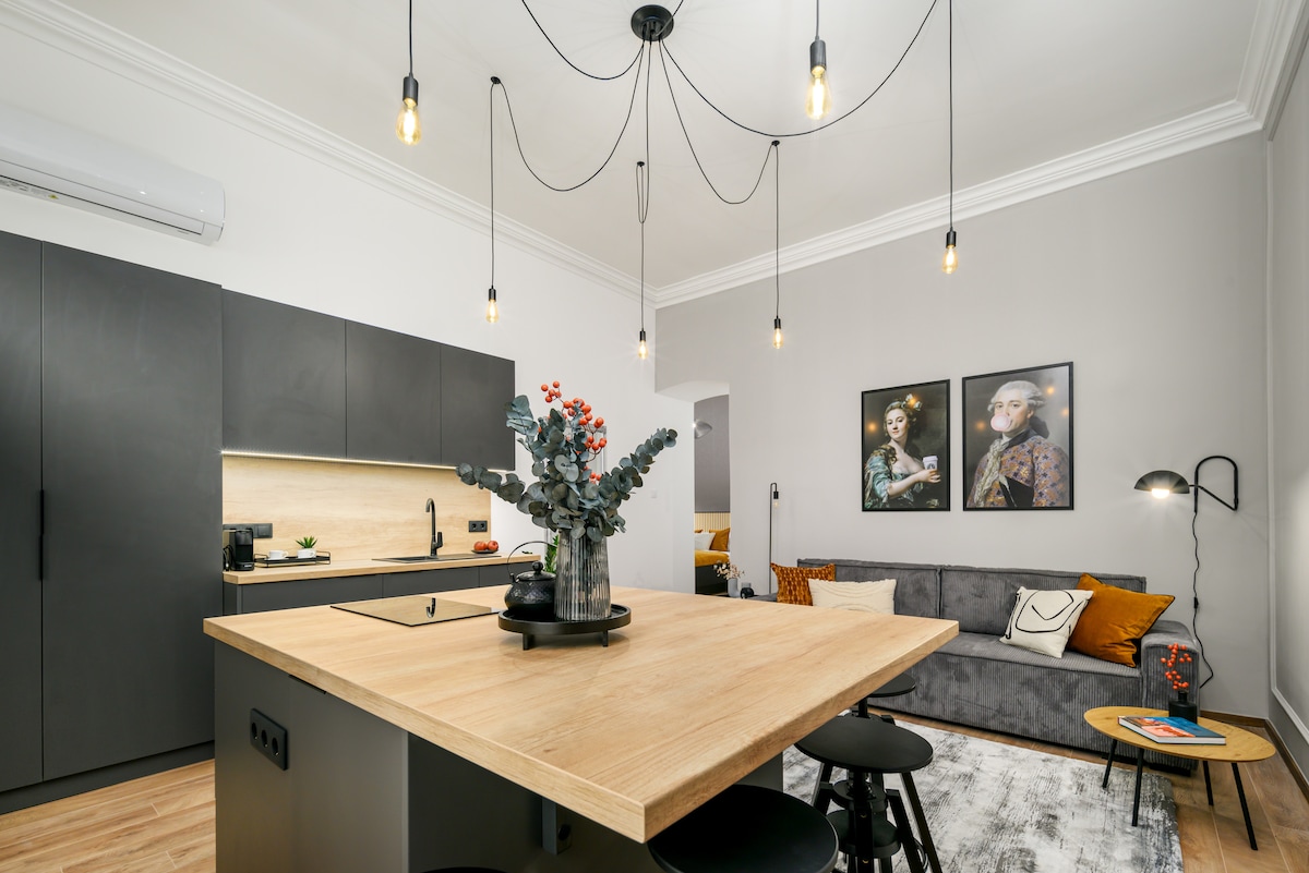 The stylish one bed huge 75sqm apartment has been fully renovated with stylish design in a mid-century beautiful house. The apartment is on the 3rd floor with an elevator in a very quiet area in the building. Located in one of the most fashionable areas of Budapest with city’s best bars, pubs, restaurants, museums, galleries, designer clothing boutiques, shops and historical architecture at your doorstep. The apartment has one bedroom, a living area, fully equipped kitchen and one bathroom.