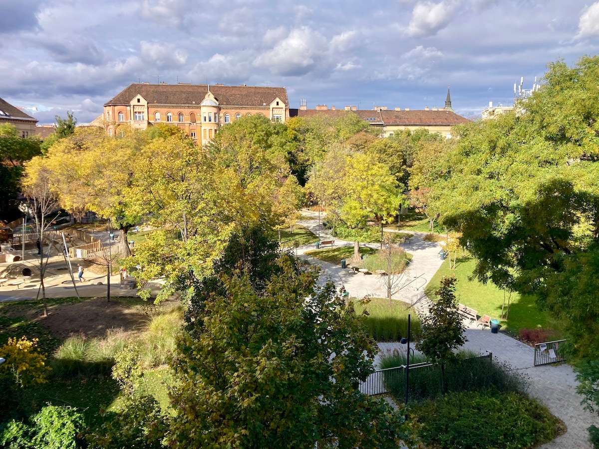 The view is of our renewed beautiful green park! The apartment is suitable for 6 people. The 81sqm apartment has well equipped kitchen. The kitchen has cutlery and plate sets, fridge, microwave, coffe machine, toaster, electric kettle. The apartment also has a washing machine, sauna, air condition furthermore provides shampoo and shower gel, hairdryer and 2 different size of towels per person. The building is over 120 years old, its period atmosphere is unmatched!