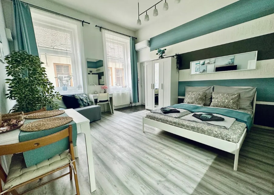 If you need a home from home in Budapest, look no further, this is it. Not only is it smack right in the middle of everything, but it is a haven of tranquility when you up on the 7th floor. The black out curtains and the good bed ensures your good sleep. The apartment is light filled, fitted with A/C. One side situated South, the other to the West.