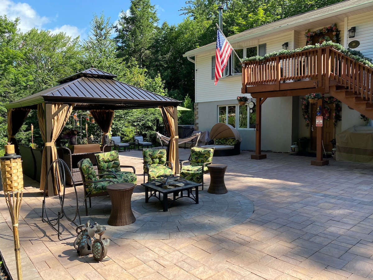 Have you ever dreamed of stepping into a fairy tale? Come experience the magic of our log house, where fairy tale dreams come to life amid the beauty of nature! Perched on a hillside of the famous Hunter Mountain, just a short walk from the ski slopes in winter and mere steps from the lake in summer. With unlimited hiking options and top-notch golf courses just minutes away, our location truly has it all for those seeking adventure and relaxation or a memorable venue for reunions and gatherings.