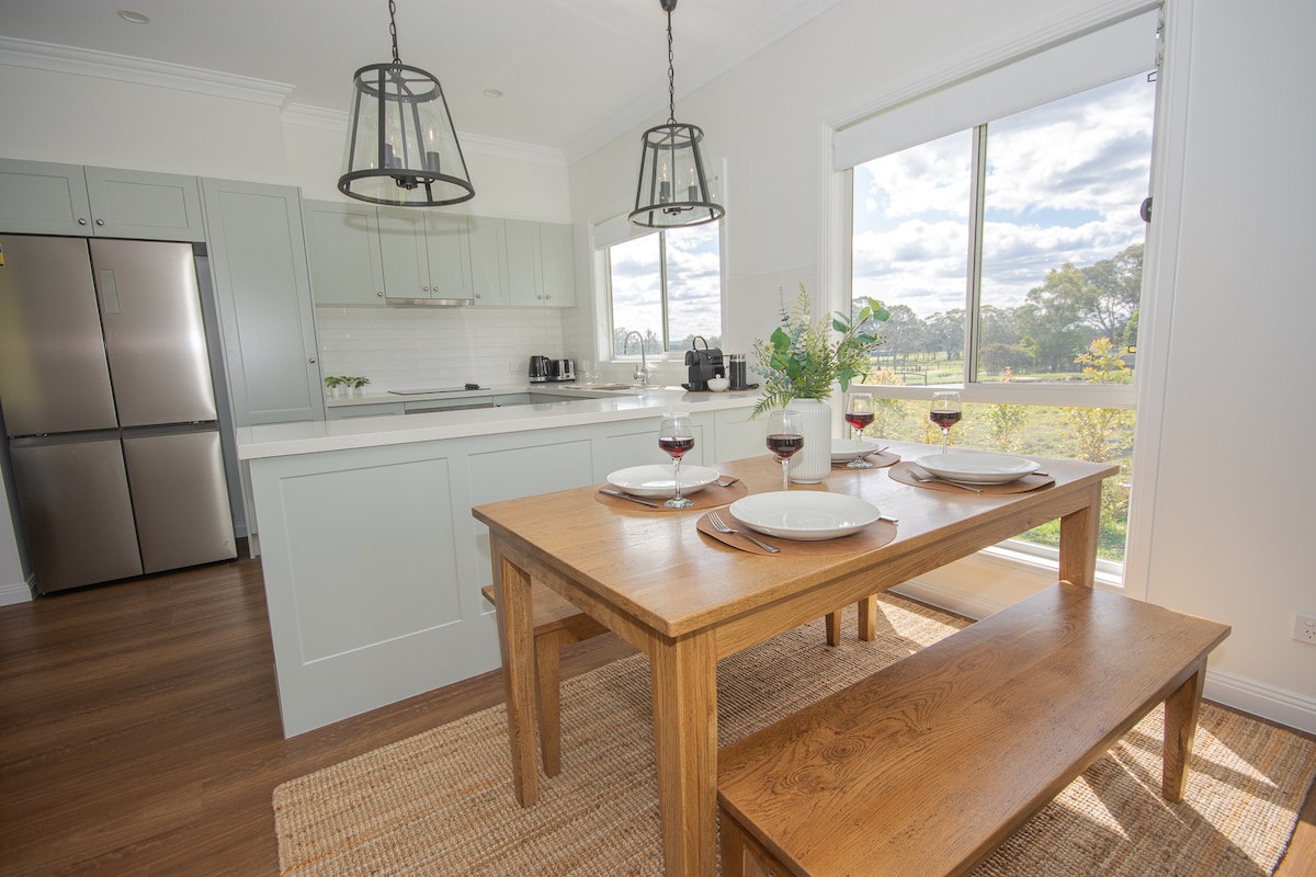 Luxurious eco tiny home in the heart of the Hunter Valley. This architecturally designed eco tiny home has everything you need for a well deserved break; privacy, amazing view of the Hunter River and surrounding bush land, queen Tempur Cloud bed and premium linen, air-conditioning, fully equipped kitchen, bathroom with eco-friendly toilet, living area with workspace, mini library, games, deck, outdoor bath, fairy lights, BBQ and fire pit.
