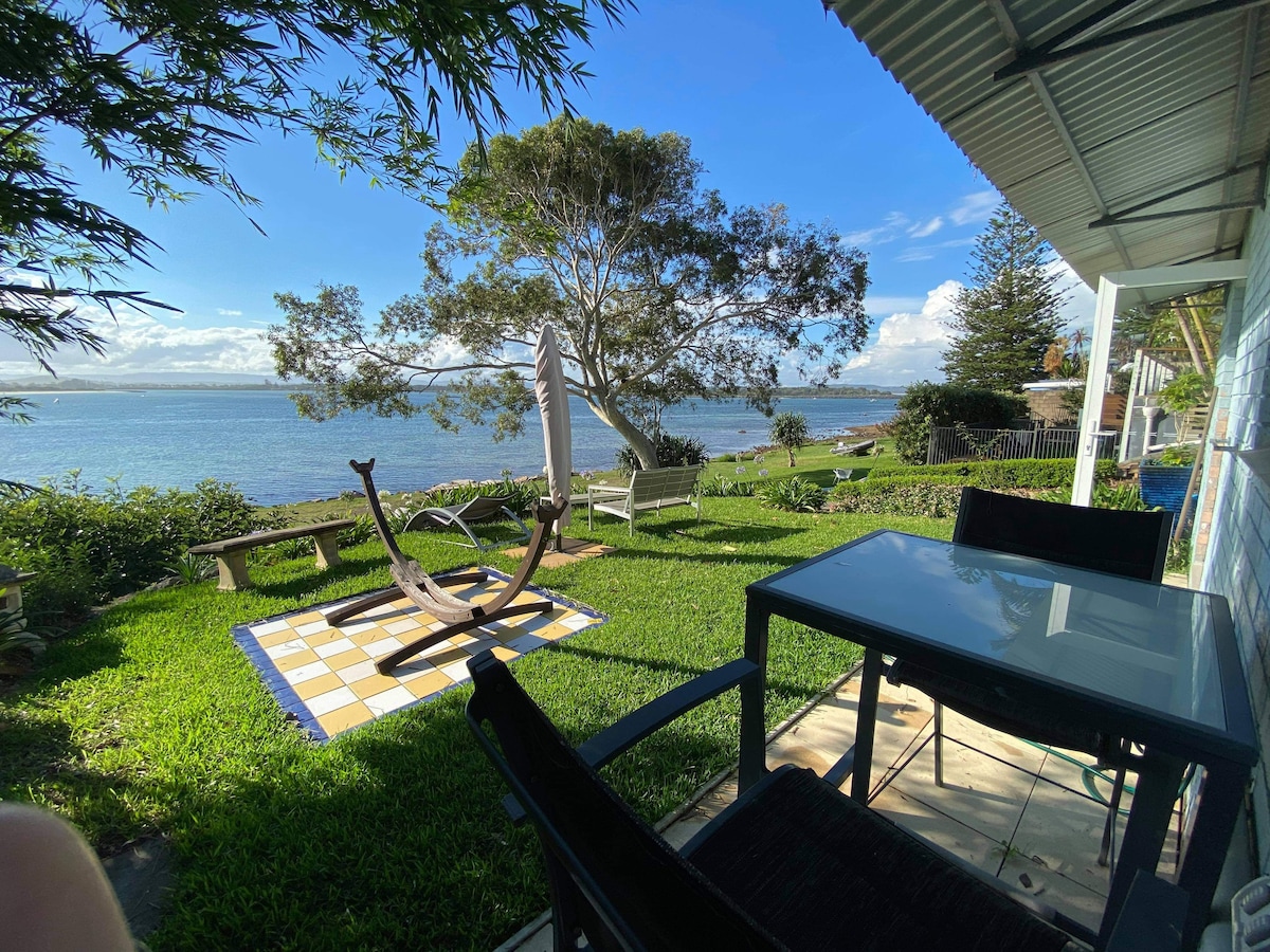 2 PEOPLE MAXIMUM NO CHILDREN NO PETS NO COOKING INSIDE The Guesthouse is located on Salts Bay at Swansea Heads. Although it is on our property, it is completely separate to our house, with a private, waterfront entrance. Access is through our front gate, down a sloping path and a flight of stairs. Unfortunately is not suitable for anyone with mobility issues. Street parking is available. Free use of kayaks. You can swim directly in front of the studio, or from the sandy beach 100m away.