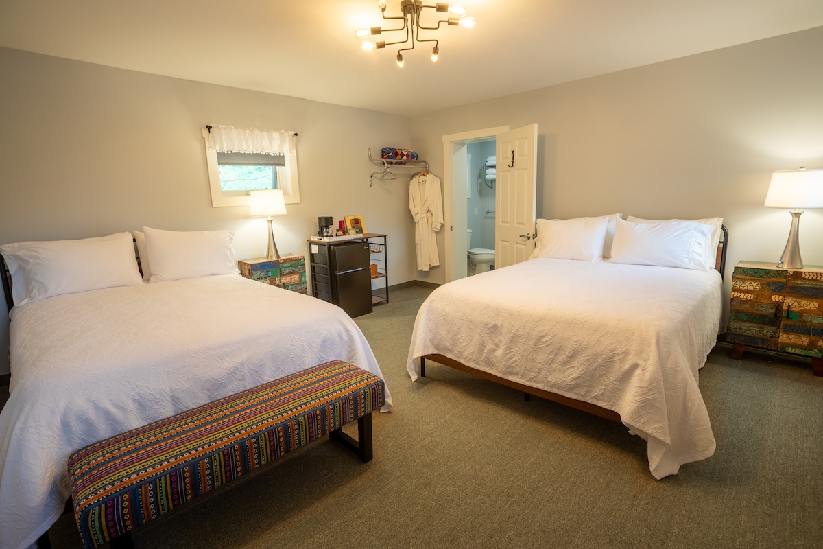 Pet-friendly, clean/fresh King bed room #12. Industrial modern feel. Comfy bedding, spacious bath, sitting area and lots of pampering goodies while you enjoy our beautiful riverfront resort location. This room can accommodate one well-behaved dog 50 lbs or less. Dog must be supervised / leashed / and cleaned up after. Guests are not permitted to leave dog unattended in room. Pet fee applies $100 for stay.