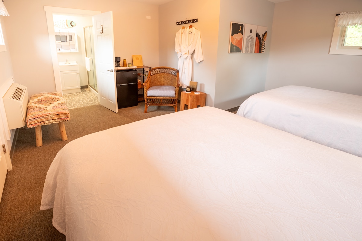 Golfers & Couples LOVE this ROOM w/2 Q beds. LOTS of light, a view of ALCC golf club house. Included are mini frig, coffee maker, toiletries, filtered water, robes, sitting area, bench, and fluffy towels. Guests enjoy shared spaces - dock, kayak/tube launch, riverfront trail, porch, camp fireplaces, and outdoor kitchen over-looking the river. Kayak & tube float excursion for nominal fee - so much fun! NOTE: No TV, Limited WiFi