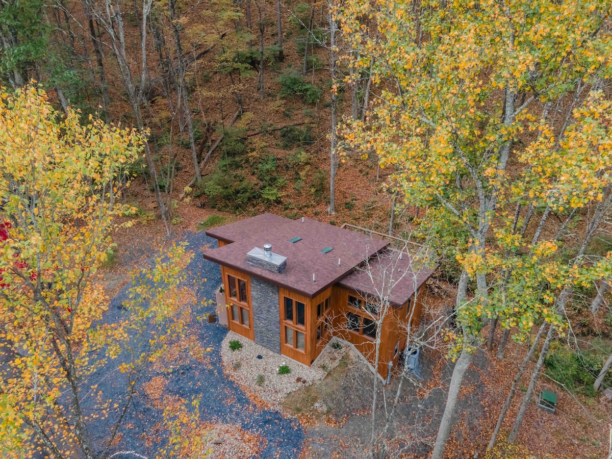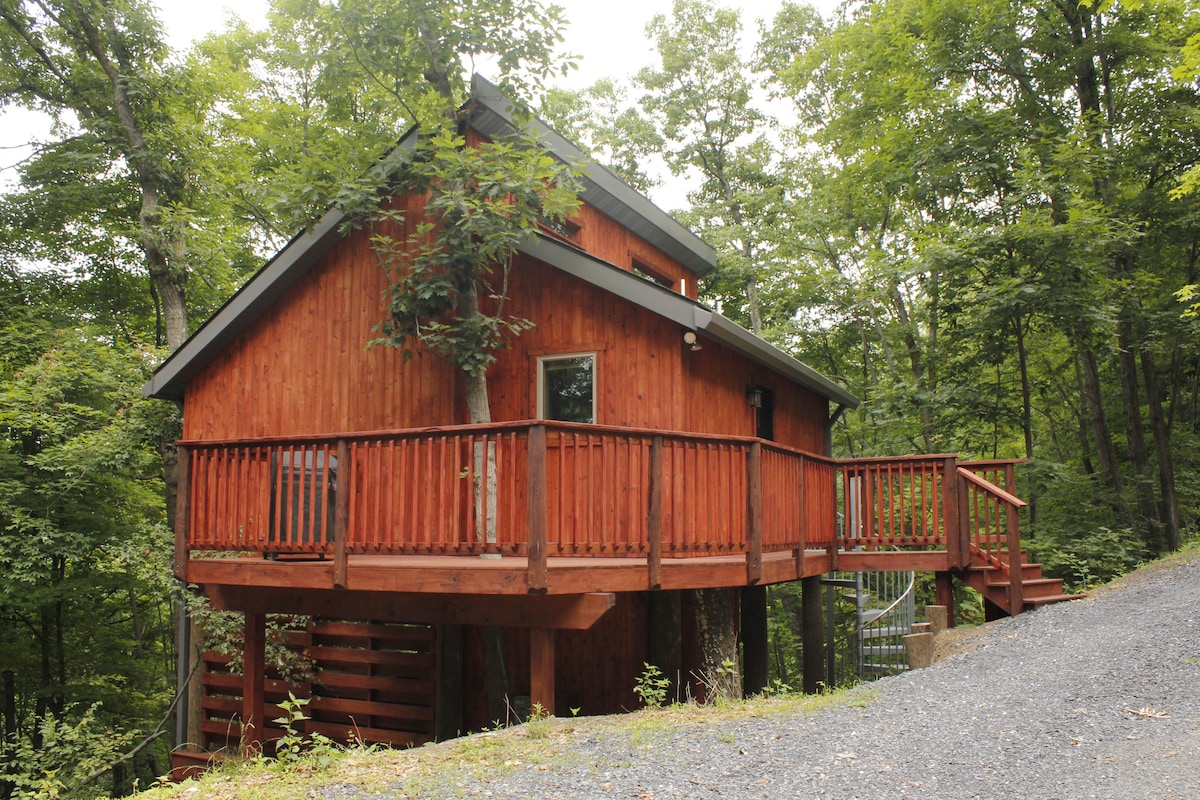 Modern 4BR/4BA cabin less than a mile from Shy Beaver boat launch at Raystown Lake. Surrounded by peaceful woods, this private home offers an open, contemporary design with space for family and friends. Enjoy an elevated deck with gas grill, a relaxing hot tub, and a cozy fire pit. Perfect for lake days, hiking, or unwinding in nature—your ideal retreat for relaxation and adventure.