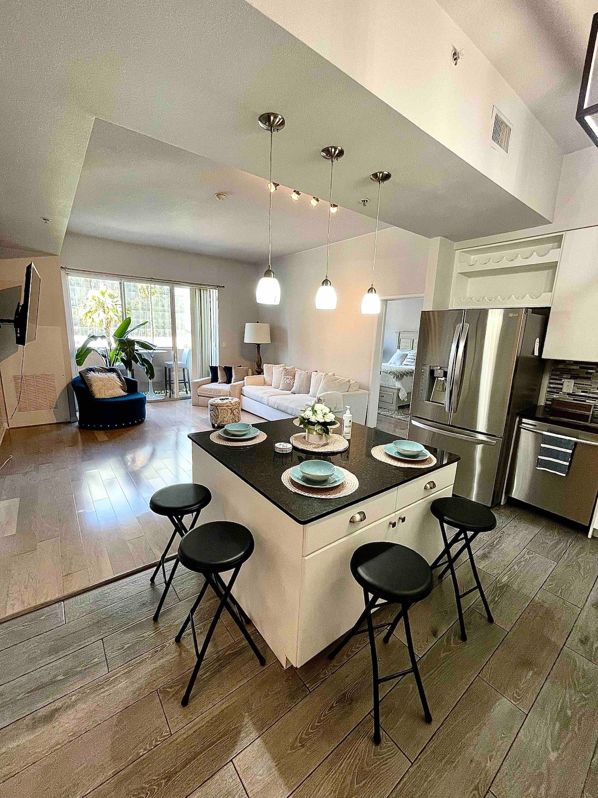 A modern wonder w/ stainless steel upgraded appliances. A high end luxury complex. Approximately 925 sq ft. Cali KING Bed. Smart 55” TV in the bedroom. A 65” Smart TV in the living room. You can log-in to your personal Smart TV Apps. Private patio with table and two chairs. In unit washer/dryer. Perfect for a family or couple getaway, business trip or long stay. Always clean and ready when you arrive. Prime location in Irvine near 405 freeway. Please ask us any questions.
