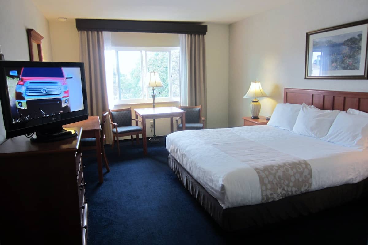 Our elegantly designed Deluxe King Room showcases refined decor, custom hardwood finishes, and exquisite furnishings, including a king bed and a work desk with a chair. The room is equipped with modern amenities such as a lighted makeup mirror, mini-fridge, Keurig coffee maker, iron and ironing board, hair dryer, laptop-sized safe, flat-screen television, and a radio/alarm clock for your convenience.
