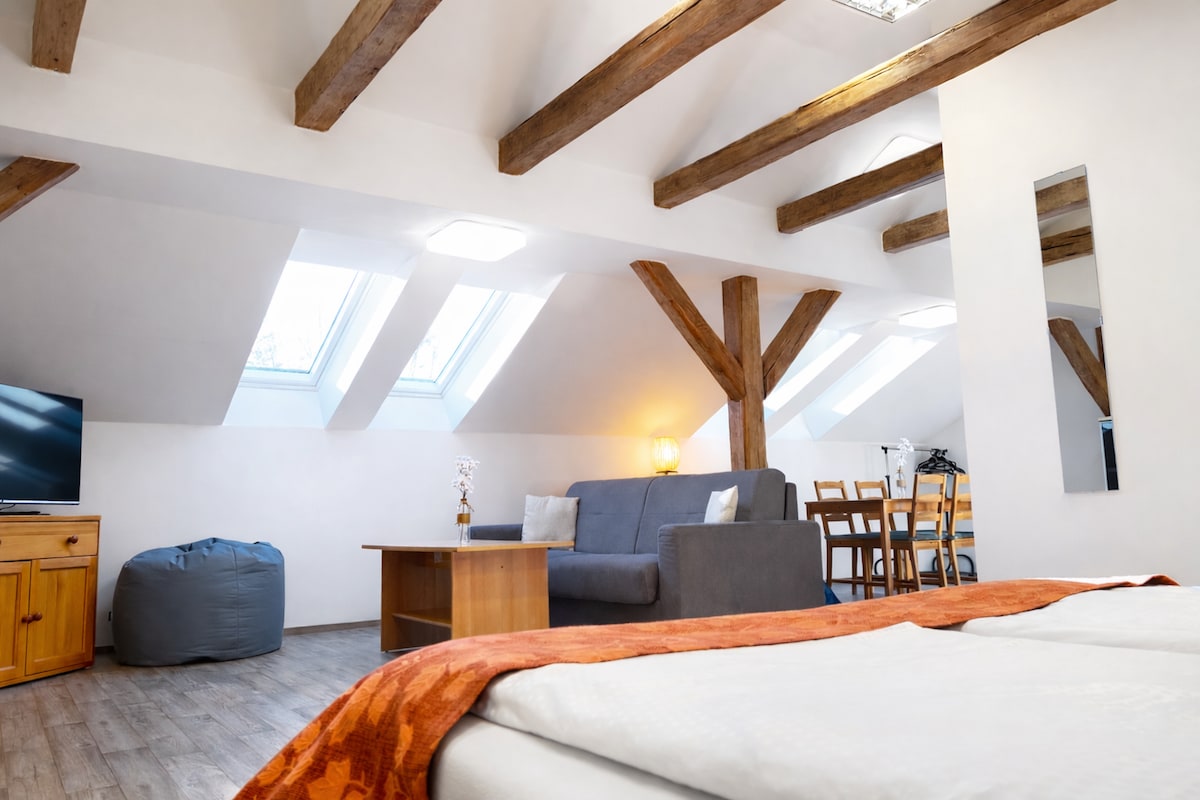 The apartment on the top floor is truly unique. It is located on the second floor and and the entire place has been restored to original building. The original roof wooden frame, exposed brickwork, original flooring, fully functional wooden stove helps you to imagine what people lived like at the beginning of last century. The main living area is facing the front of the house and therefor you will find a view on the town square, town house and the famous basalt rock “Jehla”.