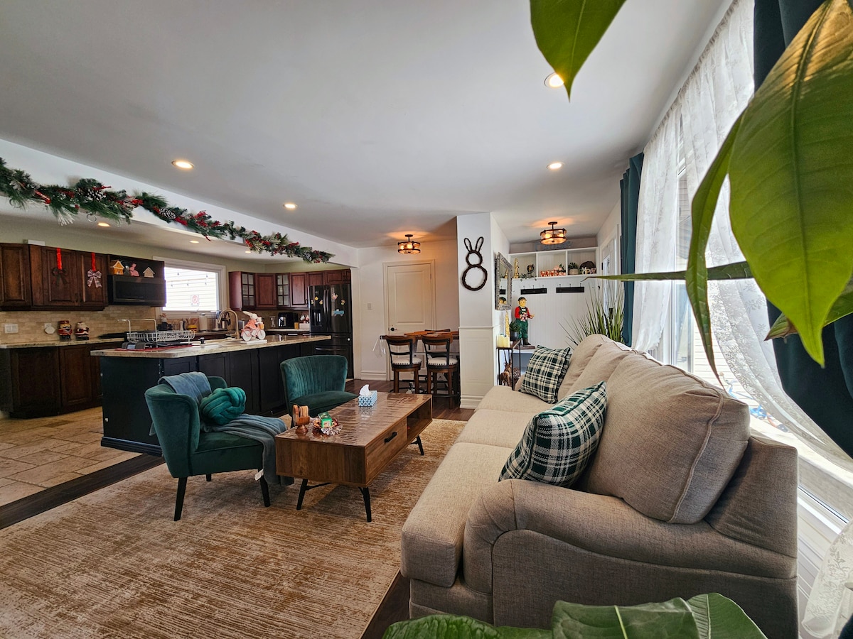 Welcome to our charming main floor apartment in the beautiful city of Orillia! This space is is suitable for families or small groups looking for a comfortable stay in a convenient location. This is a fully furnished home that features three bedrooms, one bathroom, a fully equipped kitchen with all the essentials needed to prepare your own meals. The living room is bright and cozy with a 43" Samsung Smart TV including Netflix, unlimited high speed internet and a spacious 6 seater dining table.