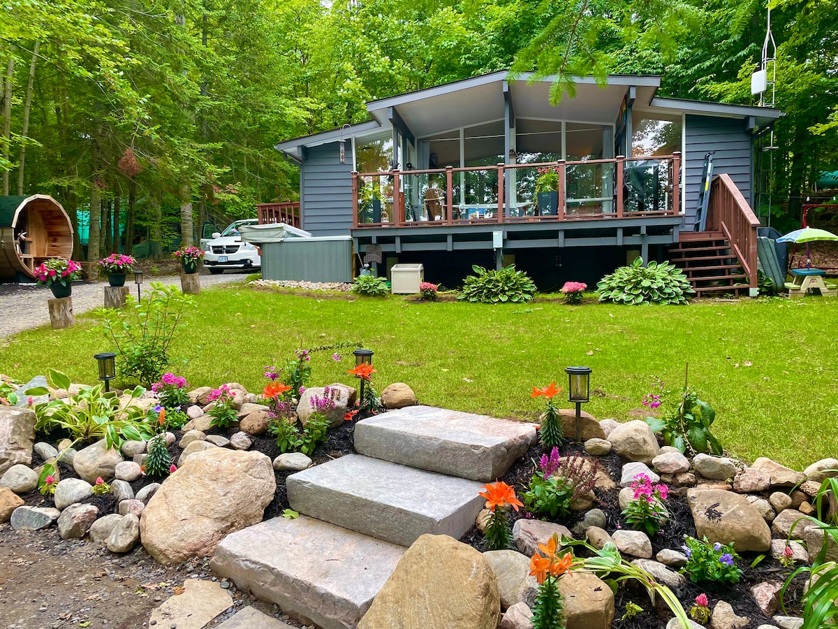 Welcome to D’oro Point overlooking Mary lake. We invite you to come relax, restore, and reconnect with nature on our 7.5 acres of wooded bliss. With only an approx 3 minute walk to our quaint neighbourhood beach, we are close enough to enjoy the lively lake life, yet maintain a private retreat feel. Stay on property and reap the health benefits of our private spa like amenities, which include the sauna, infrared hot yoga studio, and hot tub. Or, go out and explore all Muskoka has to offer.