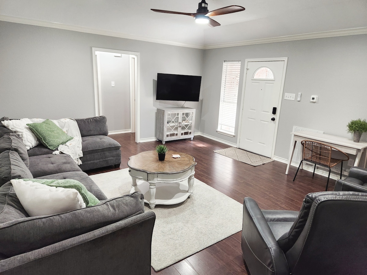 Kick back & relax in this calm, stylish space. Located less than a mile off I-45 & close to Sam Houston State University. The home is in a small neighborhood on a cul de sac. Centrally located to everything! Very comfortable home away from home. Well stocked kitchen w/ basics needed to prepare meals. Games, books, magazines, & Yoga mat in separate space. 2 monitors available for gaming/remote working Desk for remote working 2) 50” Smart TVs Wi-Fi Coffee & Tea Perfect for longer stays!
