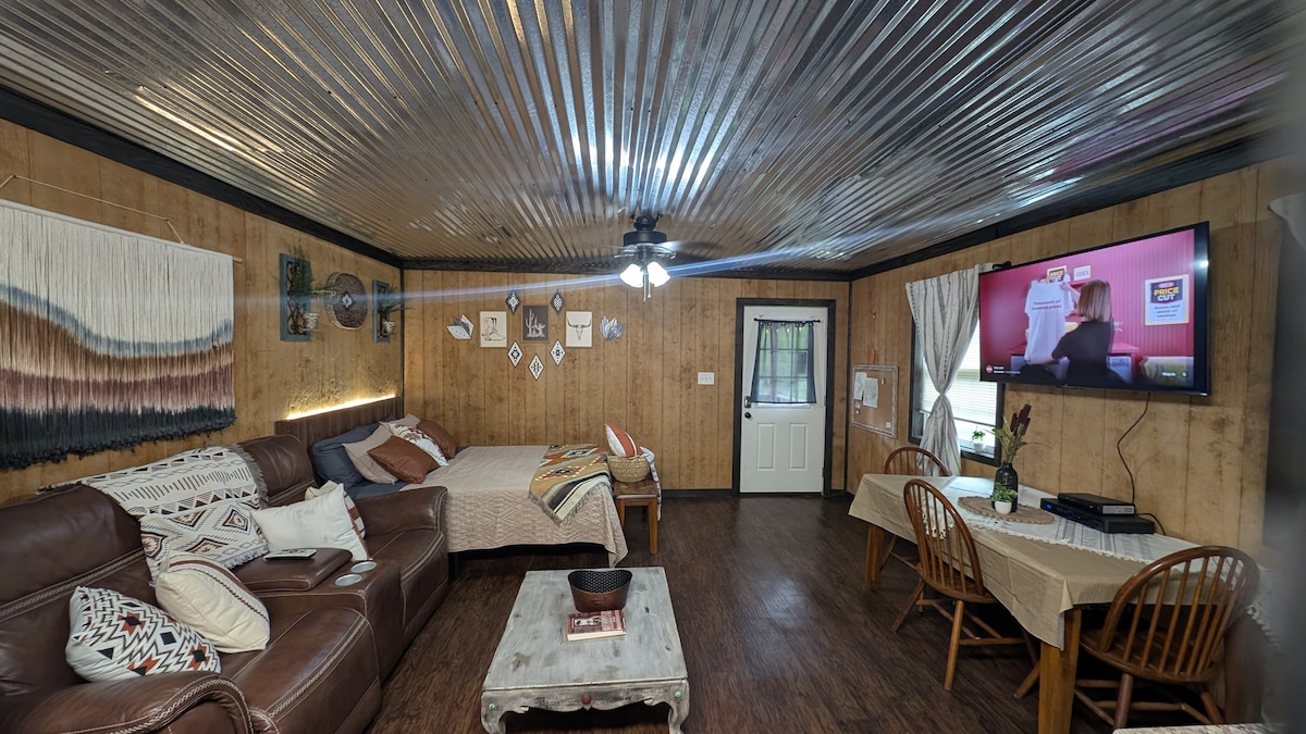 Spacious/Clean studio style cabin located on a quiet wooded property with access to 4 acre lake. Perfect for family getaways, small group retreats, fishermen, and wedding venue guests. Lake sunsets and nights by the fire make for a peaceful stay. 5 minutes from Lake Conroe. 35 - 45 minutes to Lake Livingston. Plenty of space for boat and trailer parking.