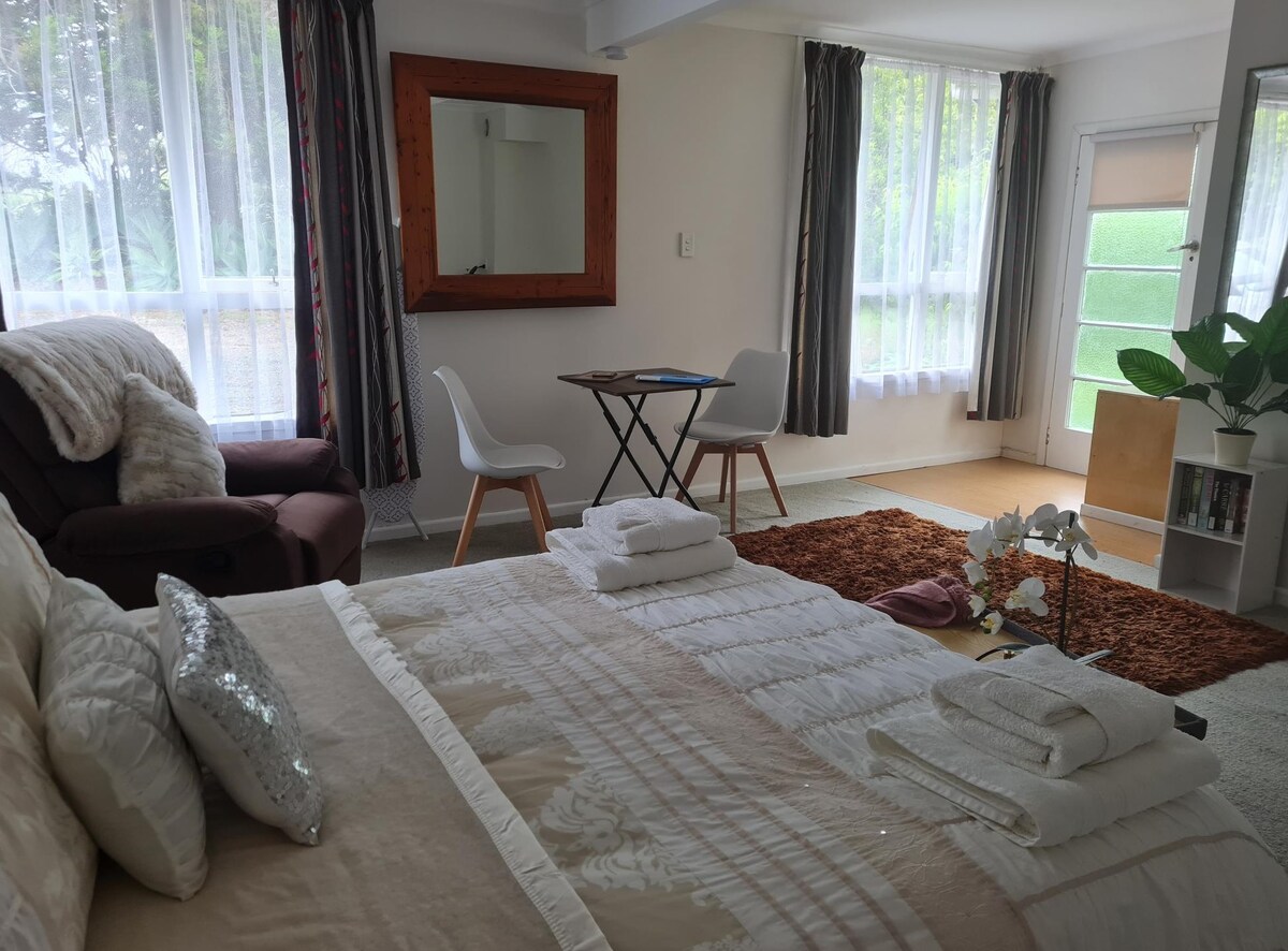 Comfortable modern space. Large studio room containing Queen bed, table & chairs and kitchenette with fridge, toaster, microwave, kettle, tea, coffee, milk and light snacks. Studio is attached to main house, has its own entrance and private outdoor area . Off street parking. Semi -rural with easy access to both Nth & Sth motorways. Approx 2.5 kms to village.. 25kms from Airport. No public transport so you do need a vehicle. If needed can provide a single airbed and port a cot .
