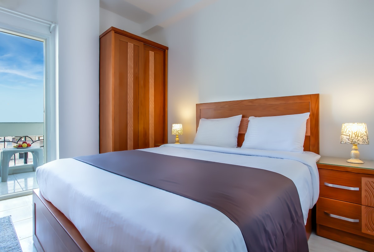 Enjoy a stylish experience at this centrally-located place. 175 square meters dual view with a stunning sea view large terrace , master bedroom with a second balcony mountain view includes a strong air conditioning, small room with bed king size tv and wardrobe in addition to a brand new ac in each room .fully equipped kitchen bathroom and living room , big tv with extra fees for Netflix and bundles