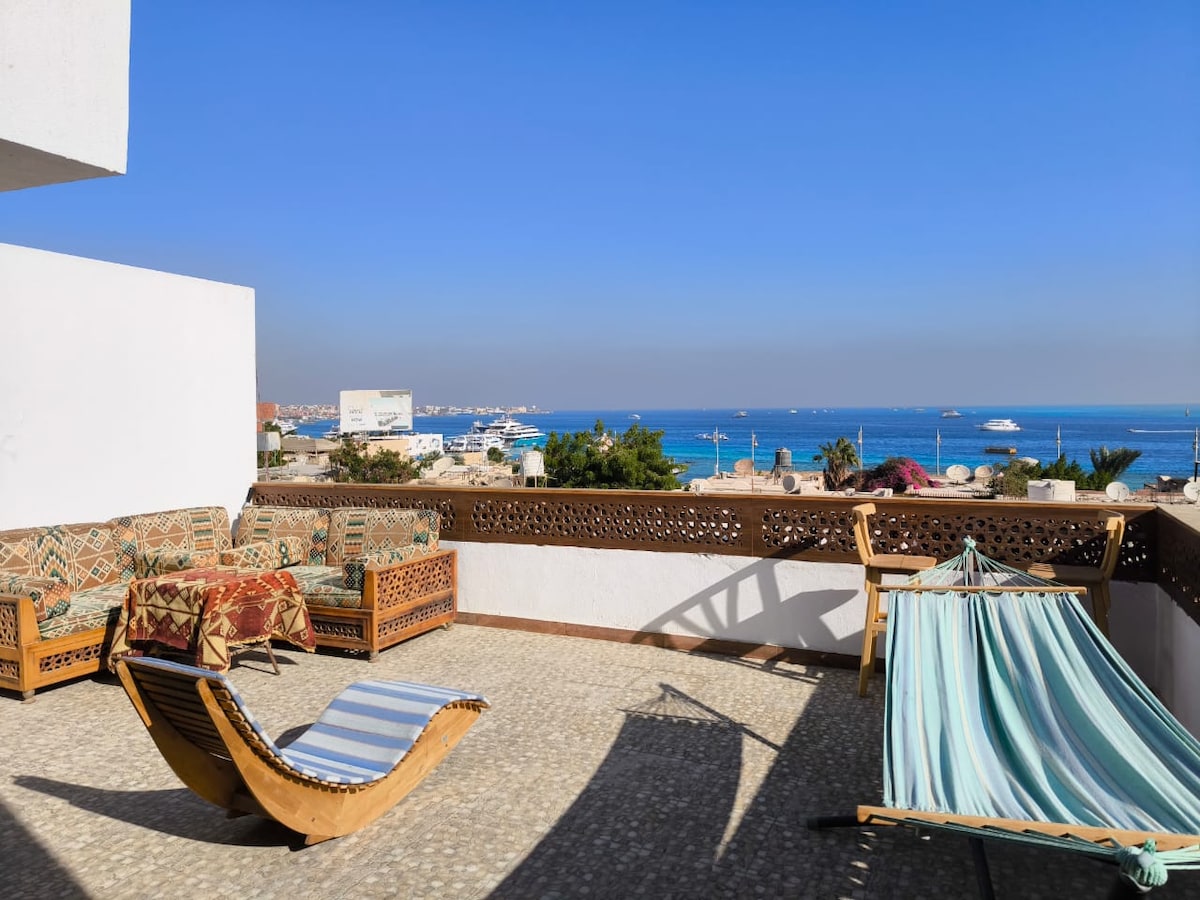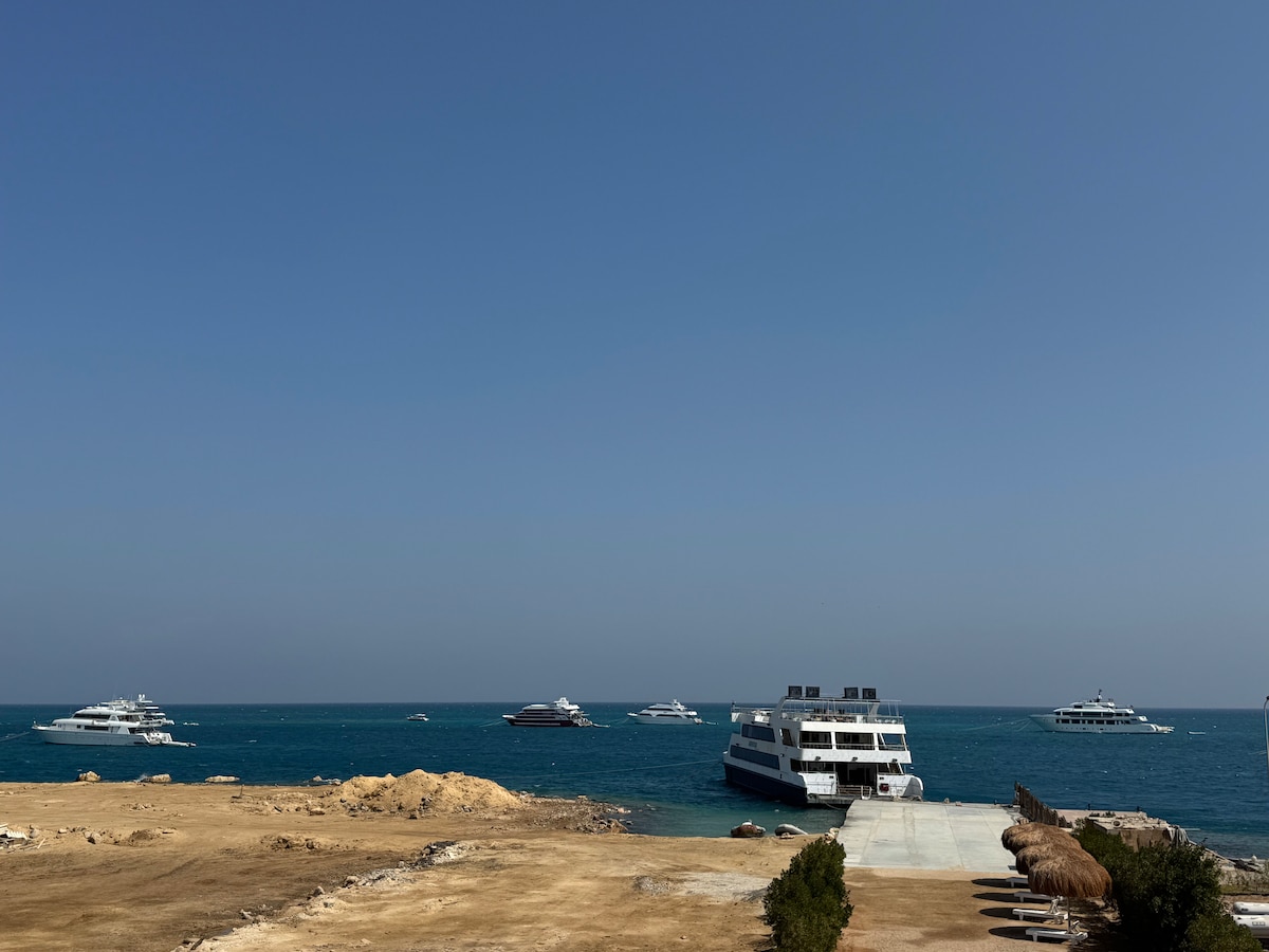 On the coast of Red sea, Egypt overlooking the majestic blue waters of the Red Sea, the most beautiful spot in red sea, 5 minutes to free snorkeling amazing reef and colorful fish, the mother nature views throughout terrace and windows. Nothing beats the balcony morning view of sun rise, and breathy weather. or sunset throughout living and bedroom windows. Kindly read ( Other things to note)