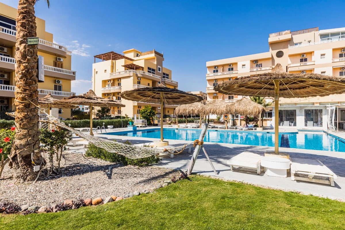 Our apartment offers you a lovely experience in Hurghada , only 5 minutes by car from the airport , you will be inside the apartment where will you have 2 bedrooms , ideal for 4 persons . A big swimming pool , garden and a private exterior pergola seatings are represented and available for use . We are very close to shopping areas , a super market , cafe and pharmacy is less than 1 minute walking on foot . Our 24\7 representative desk are there to ensure that everything is going well .