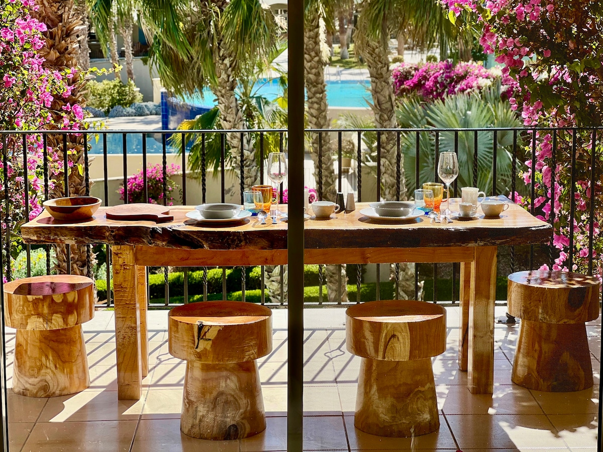 美丽的酒店单元,可俯瞰游泳池和花园