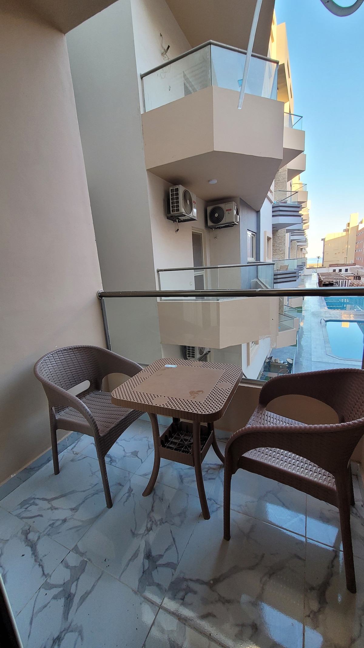 This unique place has a style Green Valley offers a calm and elegant atmosphere where comfort meets open views. From the private balcony, soft wicker seating creates the perfect spot to relax and enjoy the fresh air. The view opens onto beautifully designed buildings with warm tones and classic architectural details, all under a wide blue sky that adds a feeling of space and serenity.