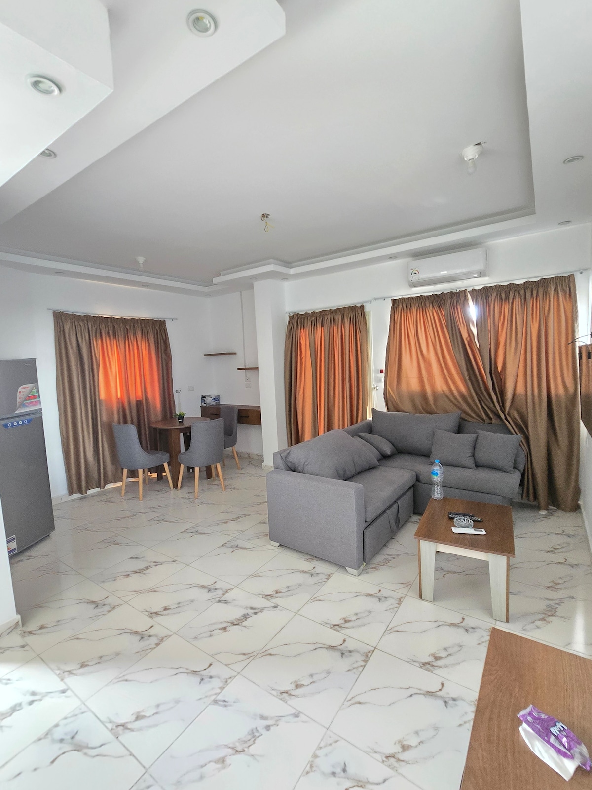 This modern, open-concept studio apartment offers everything you need for a comfortable stay. The bright and stylish living area features a cozy sleeping space, a fully equipped kitchenette, and a seating area, all seamlessly integrated into one inviting room. Step onto your private balcony to relax and enjoy the view. Located in a vibrant area near Mamsha, Carrefour, and just minutes from the airport, it’s perfect for relaxing, exploring, or soaking in Hurghada’s atmosphere!