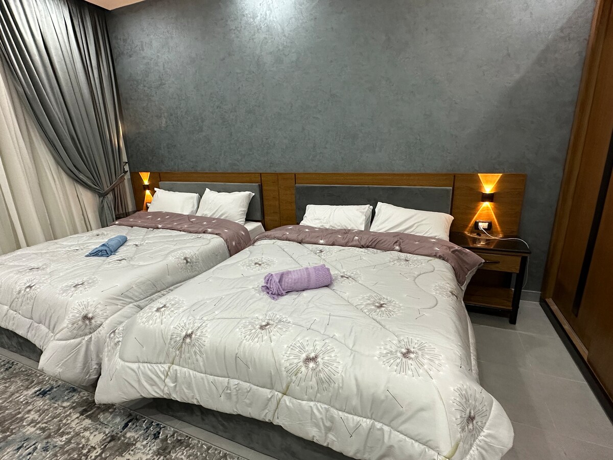 Enjoy with the whole family in this elegant residence, which consists of two bedrooms and a reception with a wonderful view of the sea and a swimming pool, where you can see the sea sleeping on the very comfortable bed or the sofa in the reception, calm with the beauty of the view is an important thing that makes you enjoy your time, and you can also relax on the balcony of the apartment where healthy sunlight is emitted from sunrise to sunset, and you can also relax on the pool on the ground fl