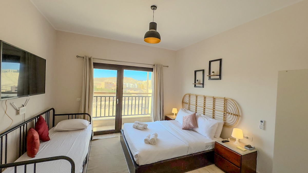 Keep it simple at this peaceful and centrally-located place. Its last level floor so you can enjoy with the special privacy ,quite and amazing with wonderful sky and garden and desert view then you staying in the center of touristeque area if you cross the street you will find all fast and delicious restaurant , then you will find a lot of access beaches by discount by us, you will find a beautiful 3 swimming pools , you will enjoy with the beautiful big Terrace