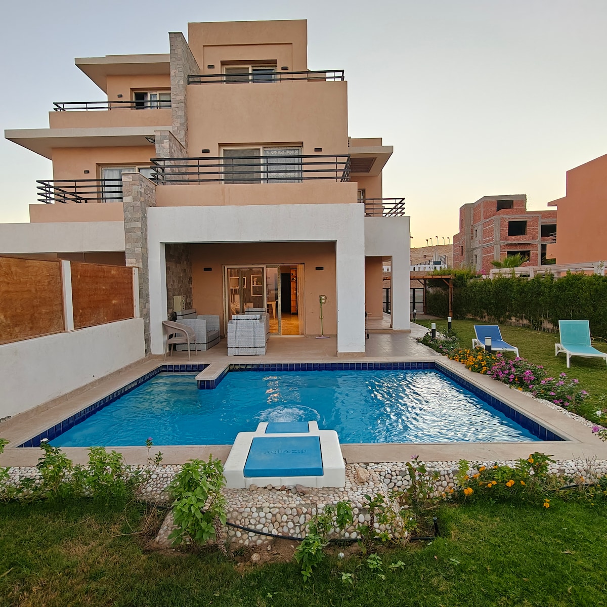 Experience pure joy and relaxation at this elegant and spacious villa in the tranquil neighborhood of Sahl Hashish , accommodating 5 guests, 5-mins drive from the city's largest shopping , Senzo Mall. Egypt's stunning beaches, Sahl Hasheesh is a mere 7 minutes, a fully equipped kitchen with modern appliances, perfect for preparing meals. a beautiful swimming pool, and a spacious terrace,24/7 security 15 mins to the airpot.
